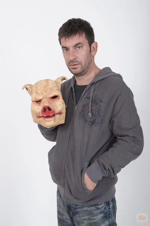Foto de Arturo Valls con la careta de cerdo, para su papel de cerdito mediano en el capítulo "Los tres cerditos" de la serie 'Cuéntame un cuento'.