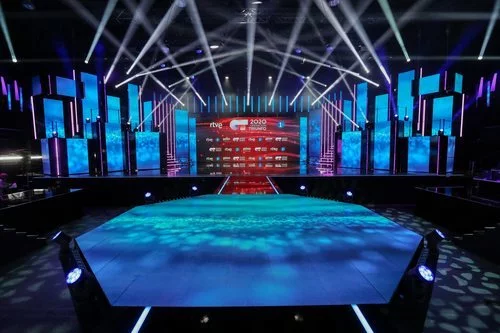 Pastilla central de la pasarela del plató de 'OT 2020', talent show producido por Gestmusic para Televisión Española. El escenario estrena pantalla gigante en el centro y cubos en los laterales.