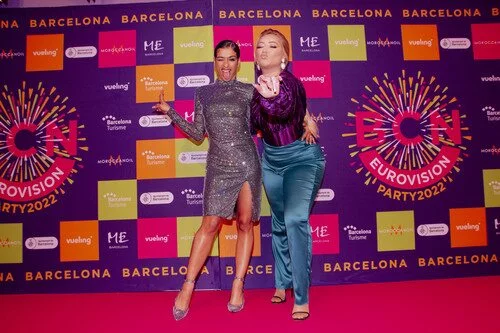 Las artistas de Eurovisión Chanel y Ronela, frente a cámara en la Barcelona Eurovision Party, celebración previa al Festiva de Eurovisión 2022.