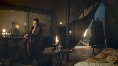 Melisandre (Carice Van Houten) está su tienda, seria y preocupada cuando aparece Jon Snow en el penúltimo capítulo de la sexta temporada de 'Juego de Tronos'.