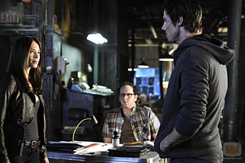 Fotograma del tercer capítulo con Catherine, Vicent y J.T en el laboratorio del bioquímico.
