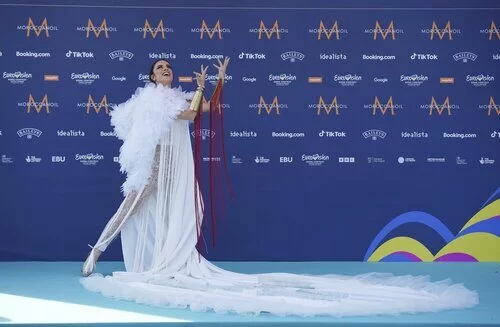 Blanca Paloma sonríe en el Liverpool Opening como abanderada española del Festival de Eurovisión 2023, después de desfilar en la alfombra turquesa.
