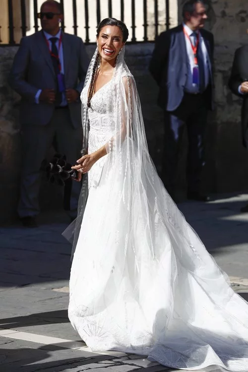 Pilar Rubio luce en su boda con Sergio Ramos un vestido del diseñador libanés Zuhair Murad, con mucha pedrería, una sobrefalda para remarcar la figura y un largo velo.