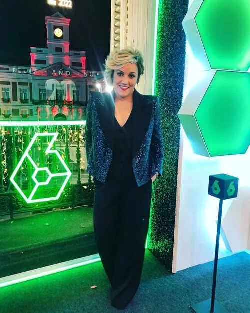 La presentadora Cristina Pardo posa con un traje de chaqueta en el set de las Campanadas 2021-2022 de laSexta.