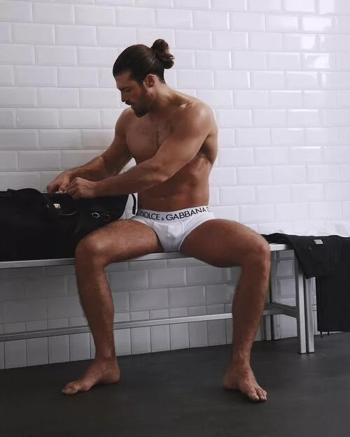 El actor se sienta con las piernas abiertas y vistiendo solo unos boxers en su provocativa colaboración con la marca de moda.