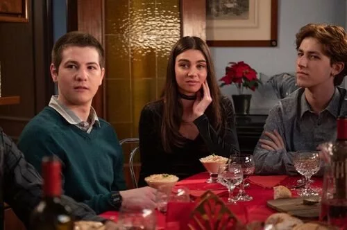 Oriol (Álvaro Díaz), María (Carmen Climent) y Santi (Asier Valdestilla) en una cena familiar del episodio 23x01 de la serie de Grupo Ganga.