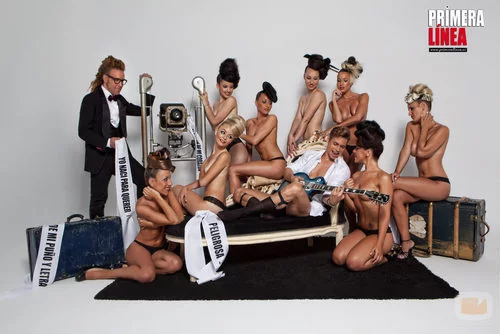 El cantante posa, con Torito, rodeado de un grupo de chicas semidesnudas.