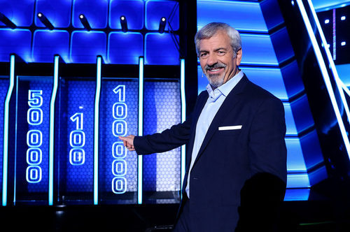 El presentador de 'The Wall: Cambia tu vida', Carlos Sobera, posa junto a las cantidades de dinero que pueden ganar o perder según acierten o fallen las preguntas.