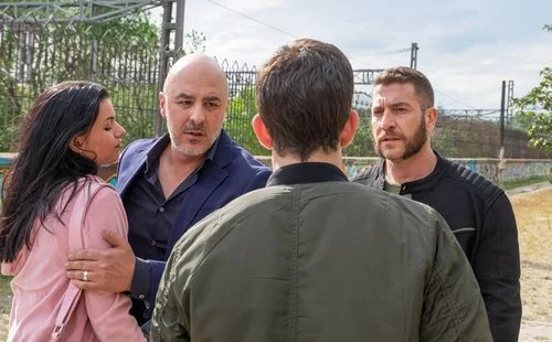 El abogado interpretado por Roberto Álamo sujeta a la joven encarnada por Oria mientras reciben la ayuda del personaje de Tejón.