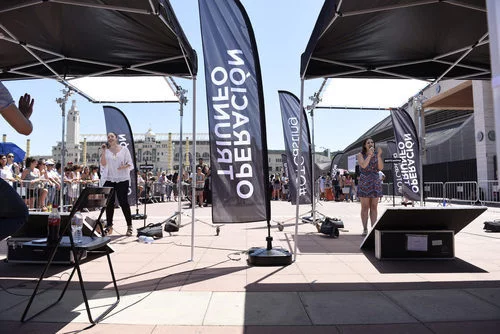 Dos aspirantes cantan, sosteniendo el micro en una de sus manos en el casting de 'Operación Triunfo 2017' en Barcelona