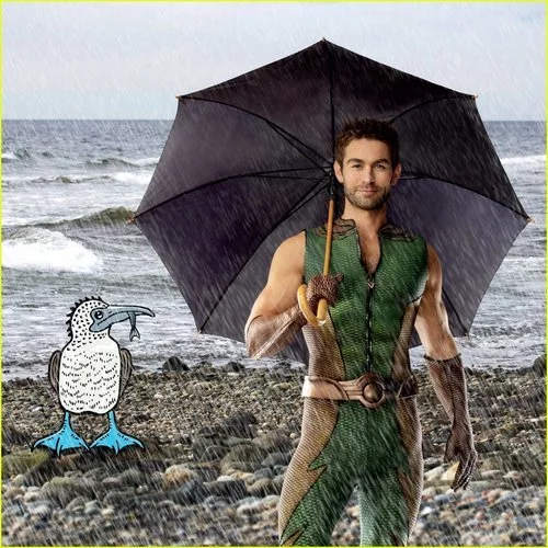 Chace Crawford se protege de la lluvia junto al mar en una de las imágenes del calendario inspirado en la serie 'The Boys'.