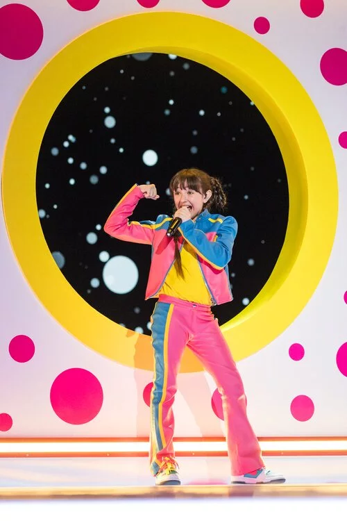 La representante de España en Eurovisión Junior 2024 muestra el vestuario del primer ensayo mientras canta 'Como la Lola' en la Caja Mágica de Madrid.