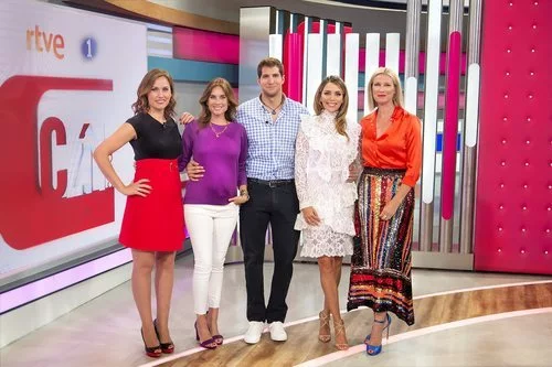 Lourdes Montes, Julián Contreras Jr y Rosanna Zanetti posan junto a las dos presentadoras del programa 'Corazón': Anne Igartiburu y Carolina Casado.