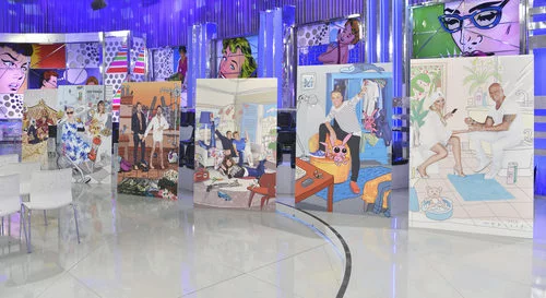 Los retratos diseñados por Javier Mariscal, expuestos en el plató de 'Sálvame Diario' en la presentación de su novena temporada.