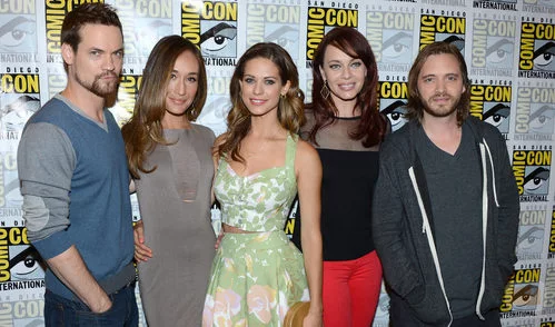 De izquierda a derecha: Shane West, Maggie Q, Lyndsy Fonseca, Melinda Clarke y Aaron Stanford de la serie 'Nikita' en el panel de la serie en la Comic-Con 2012.