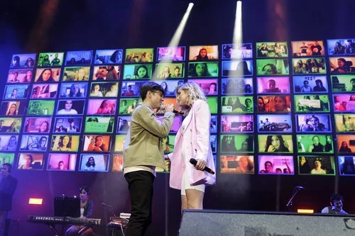 Flavio y Samantha protagonizan un dueto en uno de los concierto de 'OT 2020' celebrado en el madrileño Wizink Center.