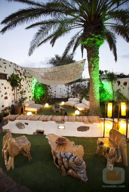 Una palmera preside el jardín de la casa de 'Ex, ¿qué harías por tus hijos?', junto a diversos tipos de asientos.