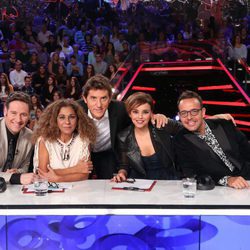 El jurado de 'Tu cara me suena' junto al presentador Manel Fuentes durante la cuarta gala del programa
