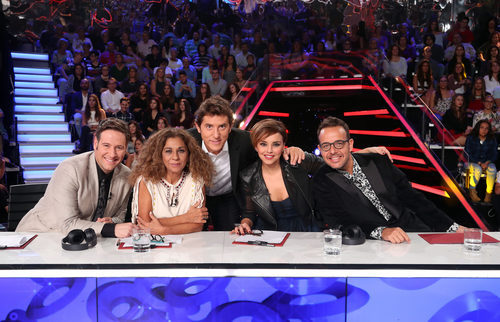 El jurado de 'Tu cara me suena' junto al presentador Manel Fuentes durante la cuarta gala del programa
