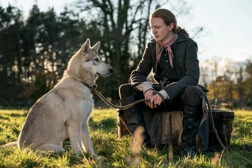 El actor escocés interpreta al joven Ian, el sobrino de Jamie Fraser en la ficción emitida por Movistar+, y posa junto a su perro lobo, Rollo.