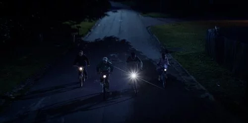 Sadie Sink, Gaten Matarazzo, Caleb McLaughlin y Priah Ferguson montan en bici en una escena de la serie de Netflix.