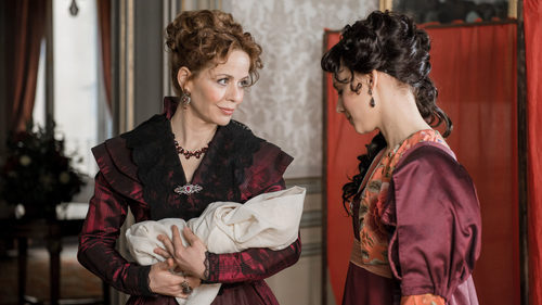 La Duquesa de Osuna, María Adánez, en una escena junto a Amelia Folch, Aura Garrido, en 'El Ministerio del Tiempo' en donde mecen a un bebé.