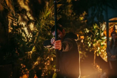 El personaje interpretado por Mario Plágaro, Edrián, lanza una flecha con un arco en 'Cupido', la nueva serie de Playz.