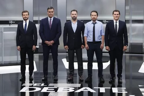 Pablo Casado (PP), Pedro Sánchez (PSOE), Santiago Abascal (VOX), Albert Rivera (Ciudadanos) y Pablo Iglesias (Unidas Podemos) posan en el 'Debate electoral' del 4-N organizado por la Academia de Televión.