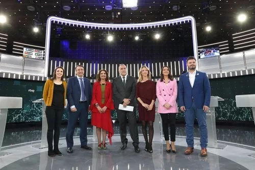 Irene Montero (Unidas Podemos), Aitor Esteban (PNV), María Jesús Montero (PSOE), Cayetana Álvarez de Toledo (PP), Inés Arrimadas (C's) y Gabriel Rufián (ERC) posando junto a Xabier Fortes, el moderador del debate de RTVE.