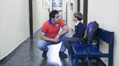 Amador (Pablo Chiapella), de cuclillas en el pasillo del colegio hablando con Ojos de pollo que le escucha sentado en el banco con la mochila apoyada en dicho banco, en 'La que se avecina'.