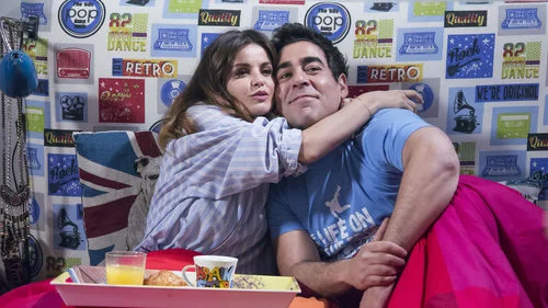 Marta Torné y Pablo Chiapella están en la cama de Amador con la bandeja del desayuno encima mientras se abrazan.