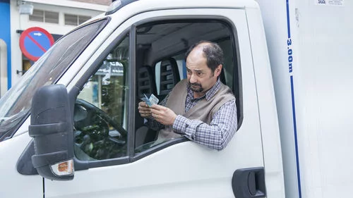 Antonio está dentro de su camión de Mariscos Recio con varios billetes en la mano y mirando a alguien con cara de pocos amigos.
