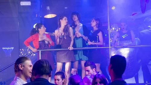 Las chicas están en una discoteca de fiesta por la noche, hablando al borde de una barandilla de sus problemas.