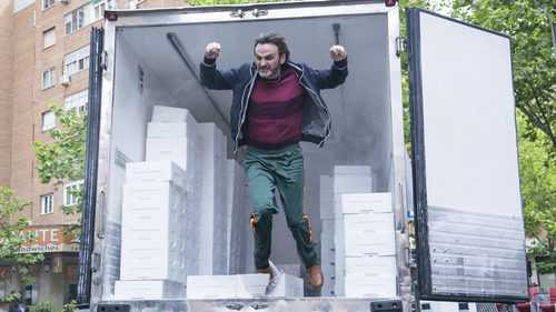 El pícaro de playa está en la parte trasera del camión de congelados de Mariscos Recio con las puertas abierta y cae rompiendo una caja.