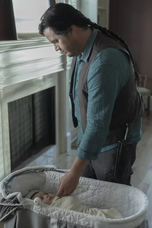 Eugene (Josh McDermitt) acaricia a Coco, el bebé de Rosita (Christian Serratos), del que ejercerá como una especie de tío en la décima temporada de 'The Walking Dead'.