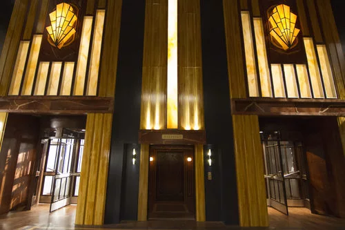 La fotografía muestra el ascensor de 'Velvet colección', que se erige poderoso en el centro de la estancia. A ambos lados, las puertas de entrada.