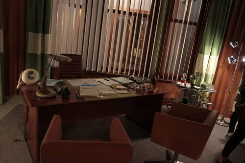 En un ángulo inclinado, la fotografía muestra un despacho vacío y oscuro de 'Velvet colección', serie de Antena 3.