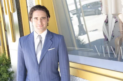 El actor que encarna a Jonás Infantes posa para 'Velvet colección' con un traje azul de rayas y una corbata gris.
