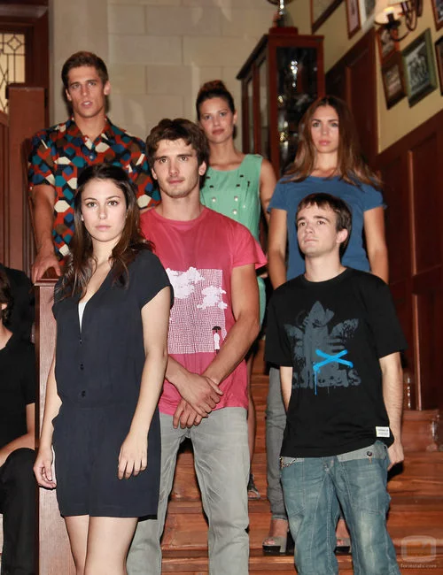 Blanca Suárez, Martín Rivas, Yon González, Nani Jiménez, Elena Furiase y Daniel Retuerta posan junto a la escalera de 'El internado'.