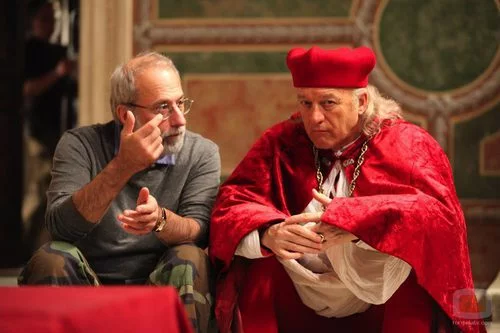 Udo Kier sentado junto al productor de la serie Tom Fontana