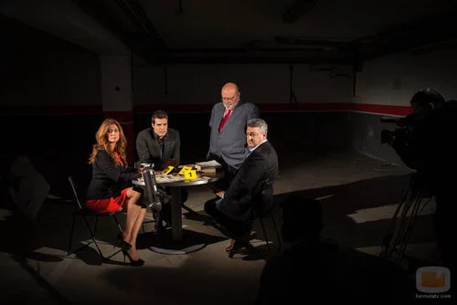 Ambos presentadores sentados en torno a una mesa con dos de los colaboradores del programa de investigación de 13tv.