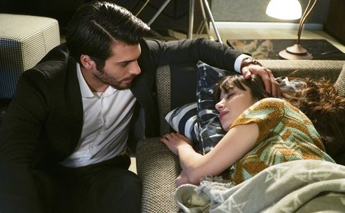 Can Yaman (Ferit) y Özge Gürel (Nazli) son los protagonistas de 'Dolunay (Luna llena)', serie turca que en España ha emitido Divinity. En la imagen vemos a Ferit acariciando la cabeza de Nazli y observando como duerme.