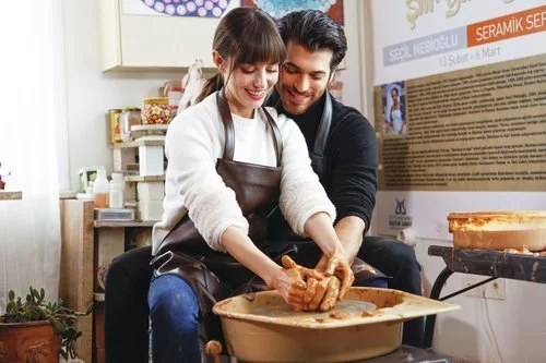 Los dos actores protagonistas de 'Dolunay: Luna llena', Nazli (Özge Gürel) y Can Yaman (Ferit), hacen alfarería en uno de los episodios de la serie.