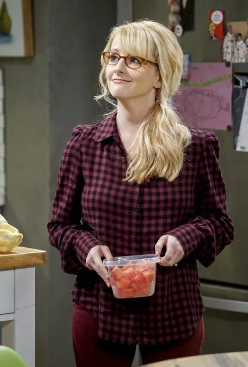El personaje de Melissa Rauch sostiene un recipiente cargado de fruta en una escena de la temporada final de 'The Big Bang Theory'.