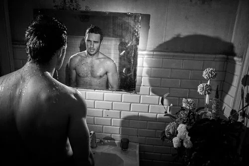 Eduardo Rosa, sin camiseta y mojado frente a un espejo