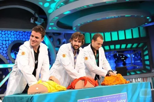 Dani Martín, Chema Ruiz y David Otero, de 'El canto del loco', reciben clases de primeros auxilios en su visita a 'El hormiguero' de Pablo Motos.