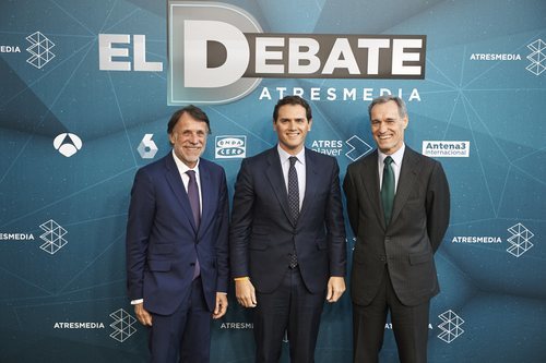 José Creuheras (presidente del grupo Planeta), Albert Rivera (secretario general de Ciudadanos) y Silvio González (consejero delegado de Atresmedia) posan para 'El debate decisivo'.