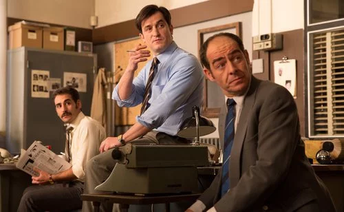 Jesús Carroza con periódico en mano y Xavi Saez fumando en el despacho de la ficción de Movistar +, 'El día de mañana'.