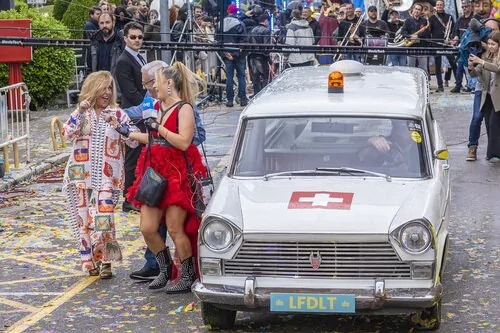 Lydia Lozano y Jesús Sánchez Martos llegaron en una ambulancia antigua del archivo físico de RTVE a 'El gran desfile', donde los recibió la reportera.