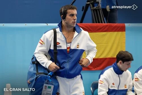 Óscar Casas interpretando al gimnasta olímpico, escuchando música, con el chándal puesto justo antes de saltar a la pista.